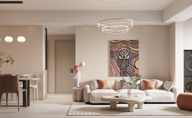 本客廳以奶油風為核心設計風格,融合現代簡約的利落與自然溫潤的質感,通過柔和的色彩、流暢的線條與質感的疊加,打造出松弛、治愈且富有層次的居家空間,詮釋了舒適與美學兼具的生活方式。
