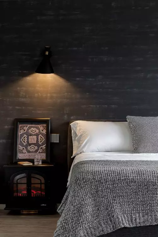 高級灰作為次臥的主調,電子壁爐的新穎床頭柜,滿足功能性同時,營造有溫度、有人情味、有藝術性的生活情境。