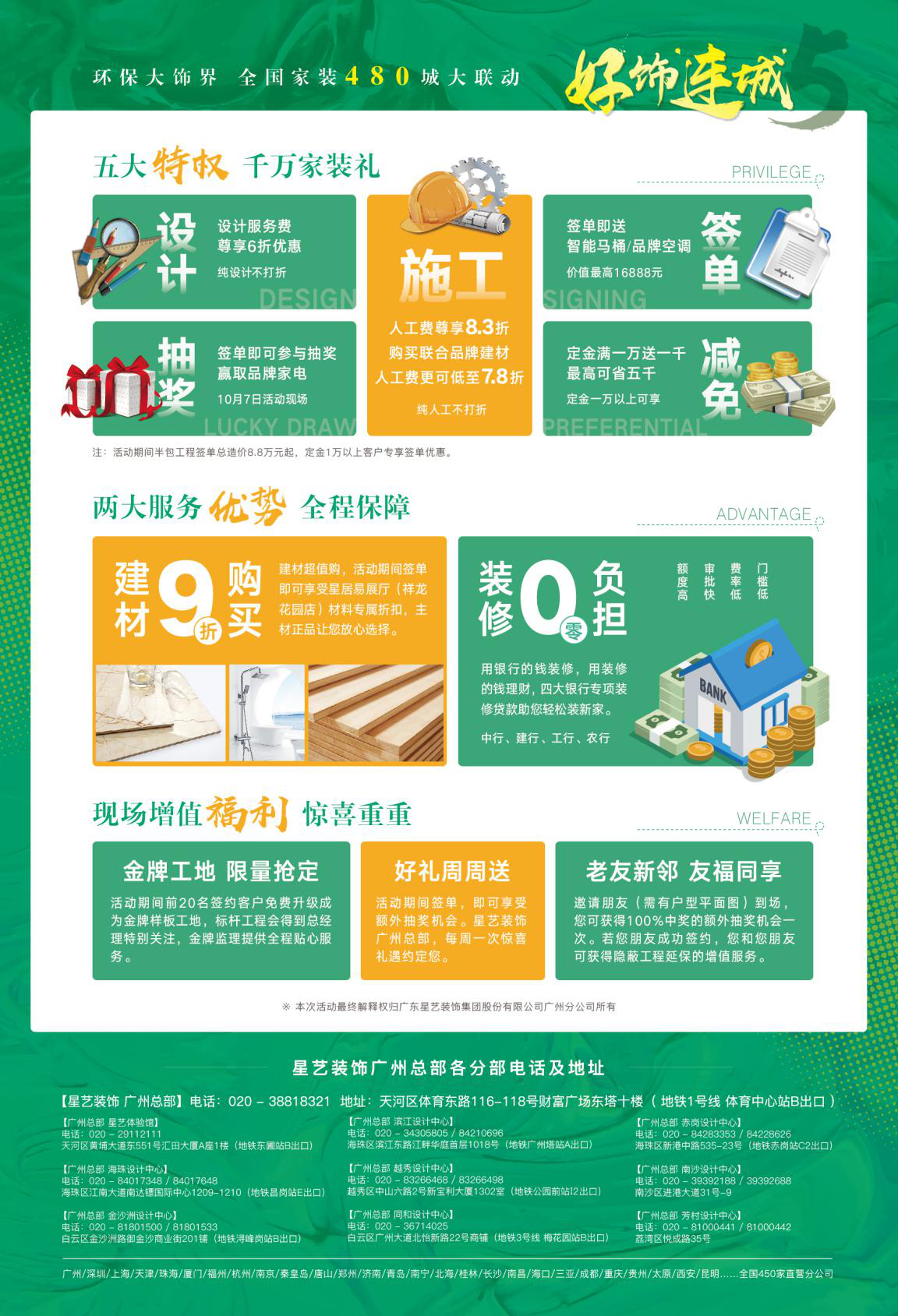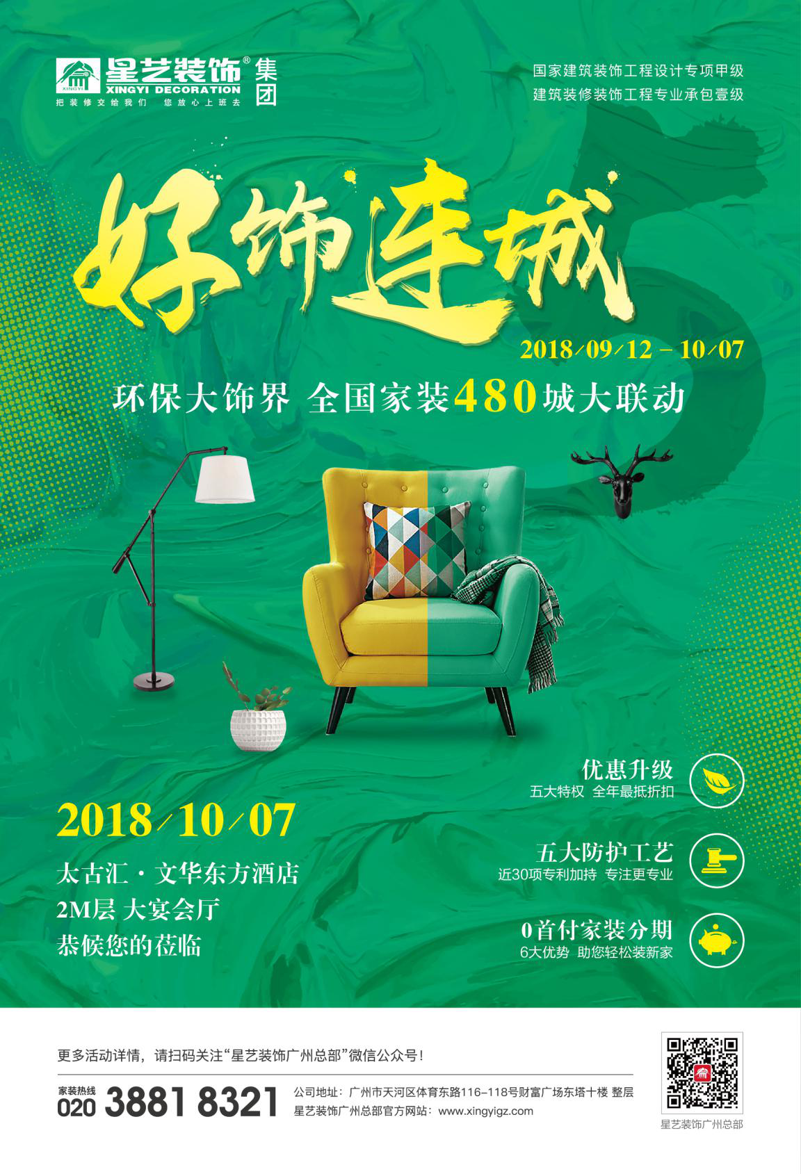 9月1日至10月7日,星藝裝飾好飾連城5,環(huán)保大飾界,全國(guó)家裝480城大聯(lián)動(dòng)。您想要的年度裝修鉅惠,重磅來(lái)襲,10月7日文華東方酒店恭候您的蒞臨!