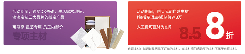 本次活動星藝裝飾廣州總部和數十家品牌建材聯合大促,指定品牌主材 尊享星藝裝飾專屬員工內部價,購買自營主材總價3萬以上,人工費更可直降至8折(純人工不打折),讓業主朋友可以一站式采購,裝修一步到位。盡量讓業主朋友無憂裝修,舒適體驗。