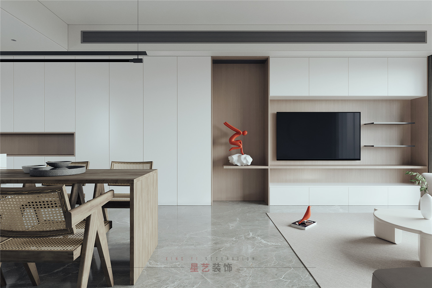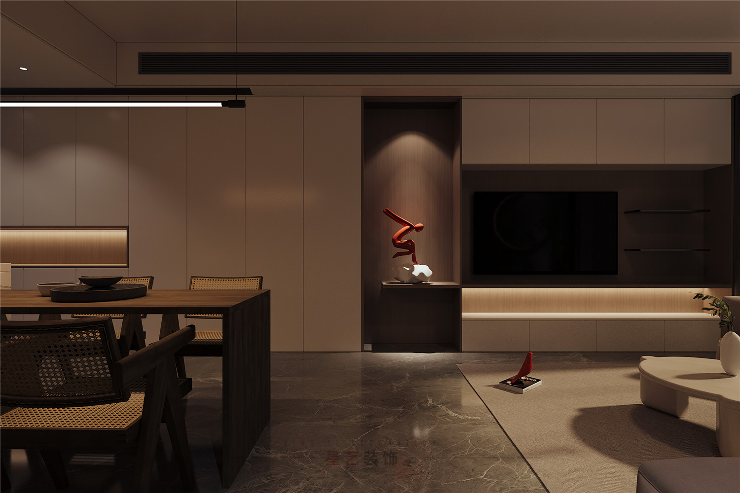 從客廳的角度可以看到極具設(shè)計感得端景,用對稱的手法把背景墻一分為二,關(guān)燈的時候可能只覺得比較特別,但開燈后,橘紅色的小人在昏暗燈光的映襯下卻營造出了藝術(shù)感和視覺美感。