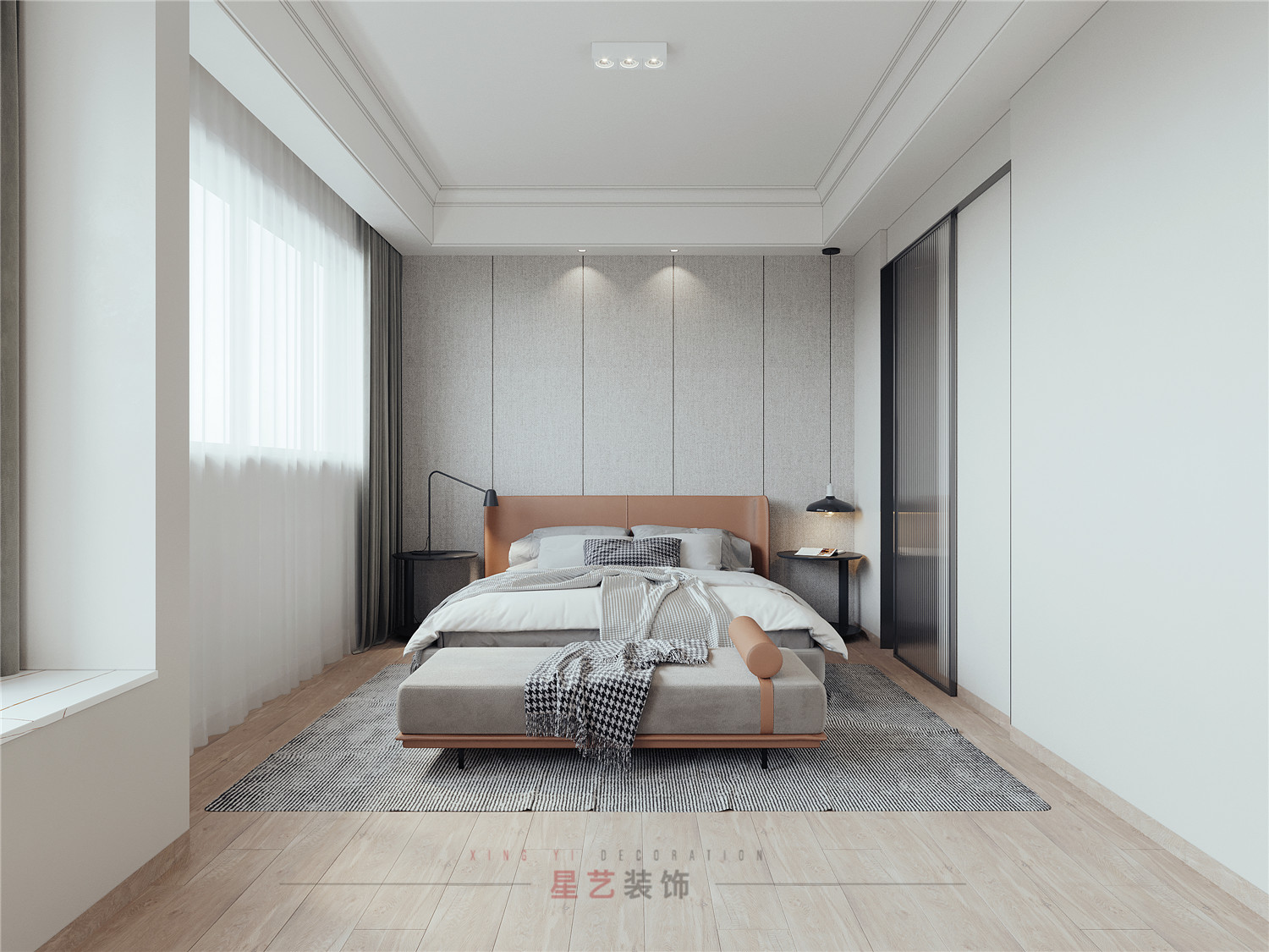 臥室里設(shè)有衣帽間,工作與生活都在客廳,所以臥室放床尾凳也是巧妙的擴大了臥室的剩余空間,不會顯得累贅還是一個多功能區(qū)域。