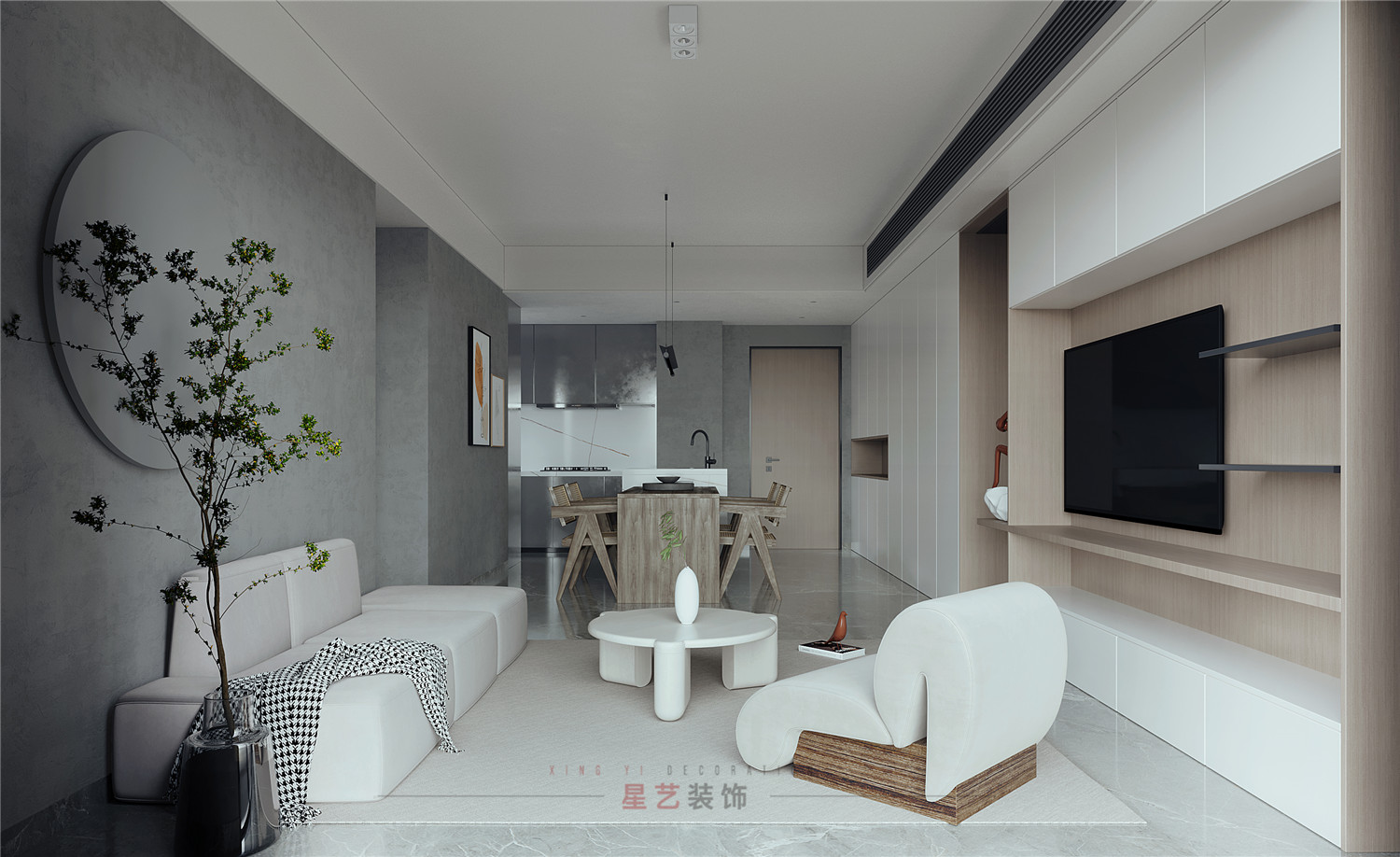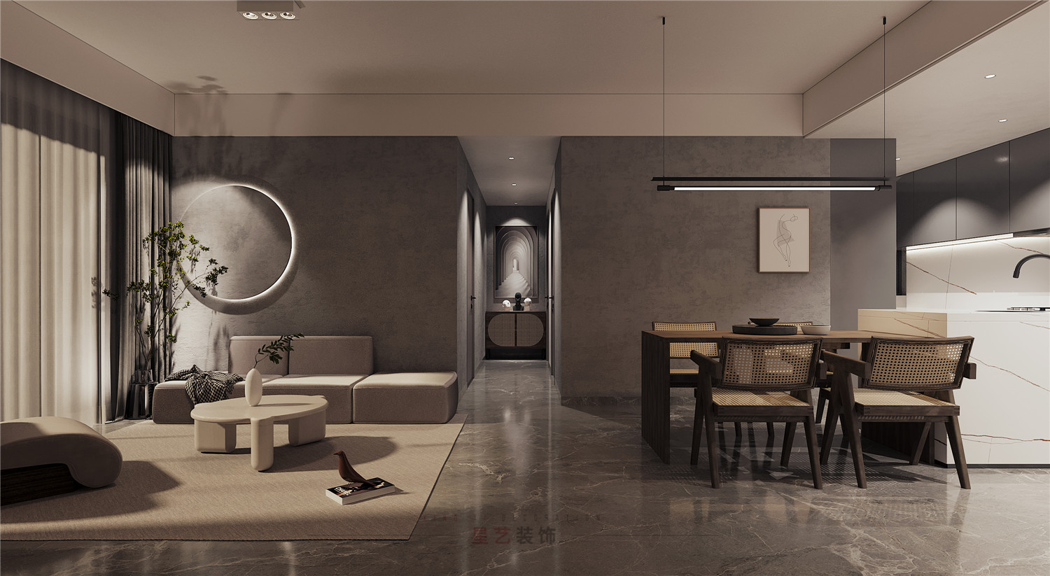 休息區(qū)主要用黑白灰的搭配設(shè)計出舒適又靜謐的空間,尤其灰色墻面凸出的圓形木藝設(shè)計,搭配燈帶像是一輪明月,在綠植的稍稍遮擋下形成了絕美的畫卷,猶如身處閑庭雅居,與最愛的人一起看花開花落。