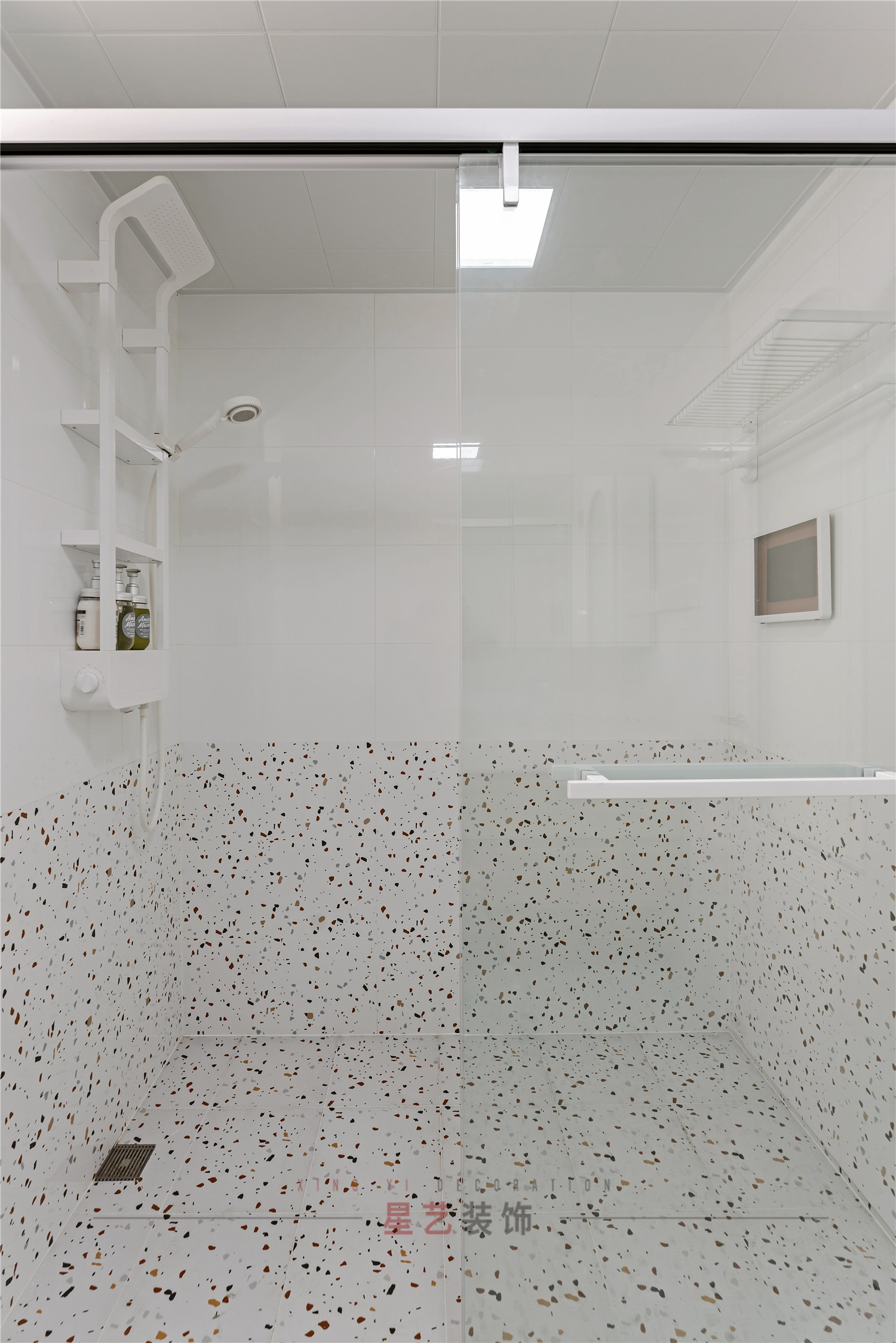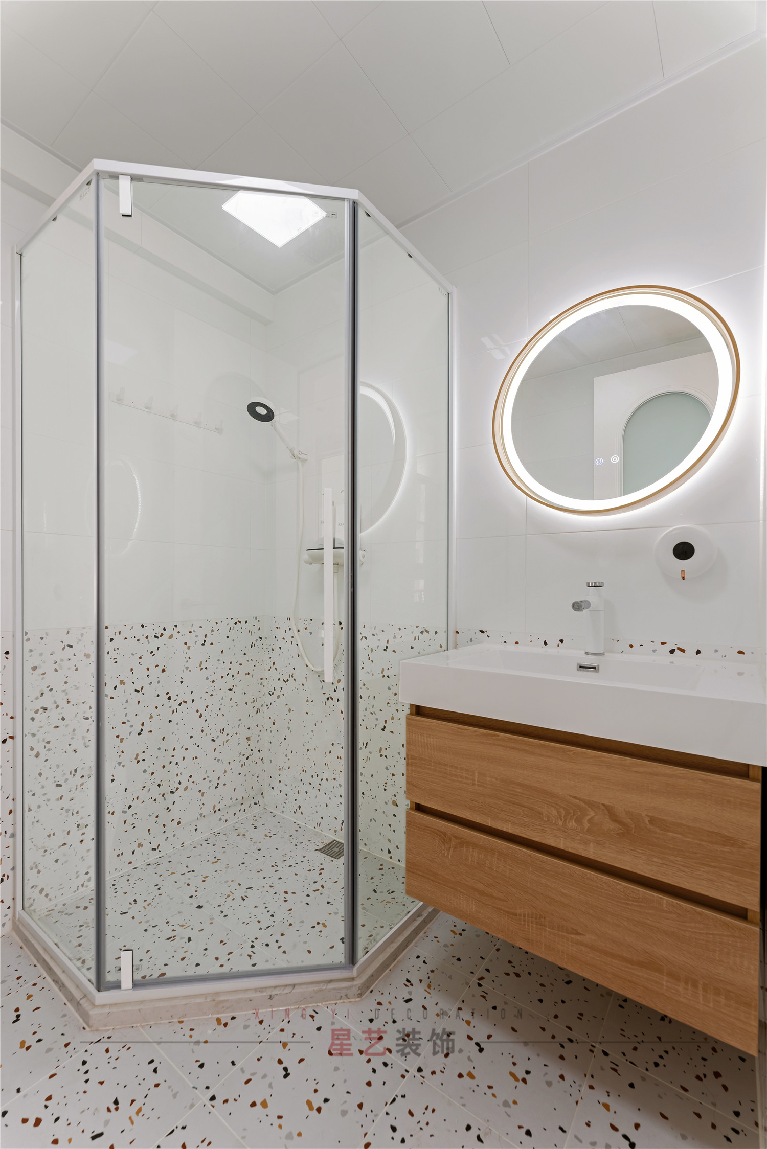 簡約卻不簡單的淋浴房一半都用彩色斑點瓷磚做鋪墊,與干濕分離的梯形區域和圓形的發光境結合,呈現出干凈有格調的輕奢感。