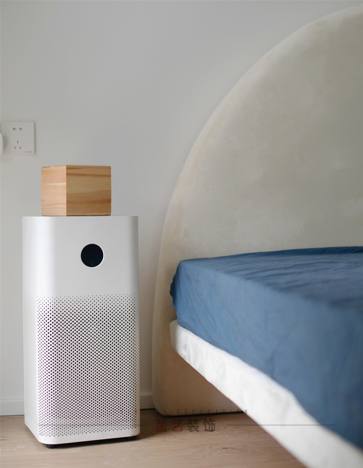 臥室在床頭的位置設計了小面積的落地窗,打破整體白色帶來的空曠感,增加層次關系。半圓形靠背搭配藍色床墊,仿佛置身于海上明月的光景中,給人帶來無限遐想