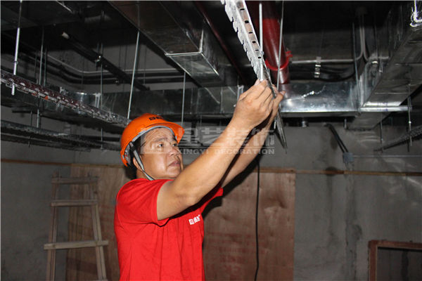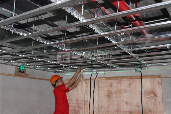 A、吊桿固定:沿主龍骨彈線位置,用沖擊磚打孔安裝頂爆固定吊桿。